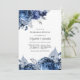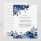 Convites de jantar de ensaios com flores azuis marinho e brancas com acentos de folha de prata.