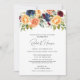Este convite para jantar de ensaio deslumbrante apresenta um luxuriante arranjo floral em aquarela de rosas amarelo-dourado, flores de pêssego, peônias azuis e flores de um profundo burgundy que se espalham pela parte superior. A tipografia moderna e limpa combina-se perfeitamente com o rico buquê de tons de joia sobre um fundo branco crocante, com um verso azul-marinho coordenado. Toda a redação é totalmente personalizável para se adequar aos detalhes do seu evento. Uma escolha perfeita para um jantar de ensaio de casamento de outono.