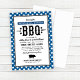 Reúna o grupo do casamento para um divertido churrasco no quintal com este convite de jantar de ensaios de churrasco em negrito. Xadrez azul clássico cerca um design gráfico de churrasco estilo western com tipografia em negrito, estrelas e uma silhueta de porco para um clima festivo e country. Toda a redação é totalmente editável para os detalhes do seu evento. Uma escolha perfeita para um churrasco casual ao ar livre ou no quintal para o jantar de ensaios do casamento.