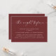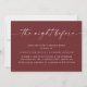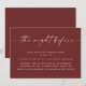Este convite para jantar de ensaio apresenta um layout limpo e moderno com um cabeçalho em letra cursiva e detalhes organizados abaixo, tornando fácil para os convidados lerem rapidamente. Projetado para a celebração "da noite anterior", inclui espaço para todas as informações importantes (data, hora, local e RSVP) em um formato simples e bem organizado. O fundo vinho tinto profundo adiciona um toque rico e elegante que funciona especialmente bem para eventos noturnos, estilos de casamento modernos e clássicos, e celebrações de outono ou inverno. Uma escolha refinada e prática para casais que desejam que seus eventos pré-casamento sejam tão polidos e coesos quanto o dia principal. Disponível tanto como cartão impresso quanto como download digital.