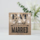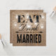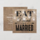 Esses convites caprichosos de jantar de ensaio de casamento campestre vêm como um conjunto de casamento combinado apresentando um efeito de juta marrom rústico no fundo, luzes cintilantes de corda em jarro de pedreiro elegante, as palavras "COMA, BEBE E CASE" e os detalhes do ensaio no verso.