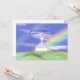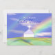 Convite para jantar de Páscoa com minha imagem de uma cena em tons pastel de uma igreja e cruz em colinas verdes com um arco-íris e céu azul acima.