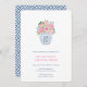 Vaso de jarra de gengibre azul e branco cheio de flores cor-de-rosa, folhagens e raminhos laranja. Todos os elementos foram pintados à mão por mim em aquarela antes de serem digitalizados. O reverso tem o padrão "Greek Key". Configurei o modelo para um Brunch de Recém-Casados, mas todos os campos de texto são personalizáveis de acordo com as suas necessidades. No verso, você pode alterar a cor de contraste (mostrada aqui como azul escuro) para qualquer cor que desejar, entrando na ferramenta de design (embaixo da área de personalização de texto, clique em "personalizar ainda mais") e alterando a cor de fundo no verso.