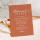 Faça uma declaração calorosa e elegante com este convite de jantar de ensaio elegante, apresentando uma caligrafia fluida combinada com letras serif clássicas em um rico fundo de terracota. A tipografia branca e um rodapé com floreio infinito dão ao design um toque sofisticado e polido. Todos os nomes, datas e detalhes do evento são totalmente editáveis. Uma escolha linda para um jantar de ensaio de casamento de outono, boho ou tons terrosos.