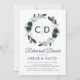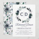 Convites de jantar de ensaio de casamento elegantes com um fundo branco chic que pode ser alterado para qualquer cor, um desenho de grinalda floral em aquarela azul naval rústica, as iniciais do casal e um modelo de texto moderno que é fácil de personalizar.