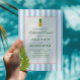 Comece sua celebração com estilo com este convite de jantar de ensaio com tema retro tropical. Com listras azuis clássicas, um abacaxi alegre e folhas de palmeira exuberantes, este design combina charme vintage com um toque tropical fresco. Perfeito para casamentos na praia, de destino ou de verão, ele define um tom relaxado e elegante para reunir amigos e familiares antes do grande dia. Totalmente personalizável para combinar com os detalhes do seu evento.