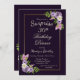 Um aniversário de 30 anos surpreendente, roxo e lavanda, janta convite de festas, com penas roxas e púrpuras e delicadas folhas verdes de samambaia.