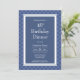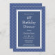 Um elegante convite de festas de janto com formato de mandala floral azul e branco.