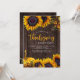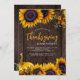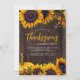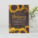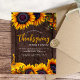 Moldura botânica laranja moderna e russa queimada com girassóis, folhas de outono e Convite de festas de Ação de Graças/Ação de Amizade com roteiro de ouro em um fundo de madeira marrom-escura. ++++ Adequado para um país rústico elegante, festa de Ação de Graças.