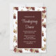 Janto Elegante de Ação de Graças Convite com fundo vermelho e folhagem colorida de outono. Com a tipografia branca, você pode adicionar suas próprias informações. A parte de trás do convite tem um menu personalizável para compartilhar suas escolhas de cozinha com seus convidados. Um convite divertido para dar obrigados com entes queridos.