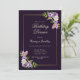 Um convite de festas de aniversário floral roxo, lavanda e cor-de-rosa com penas roxas e delicadas folhas de samambaia verde.