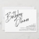 O estilo mínimo moderno janta convites com o título "Janto de aniversário" em uma fonte de script de pincel. Design fora do centro com os detalhes do evento no canto inferior direito. Texto preto sobre fundo branco.