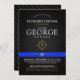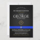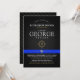Celebre um policial quando eles iniciam sua jornada como formando da academia de polícia ou ele termina sua jornada como aposentado. Este cartão de convite preto apresenta uma linha azul fina que atravessa o centro e um ponto para o nome das pessoas e o monograma em texto elegante. No verso do convite estão as faixas de linha de pinos dourados contra um pano de fundo preto. Design de adaptação para qualquer evento relacionado com a polícia, incluindo um evento empresarial, um janto, reforma, serviço memorial ou janto de graduação para um agente da polícia atual ou reformado.