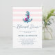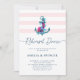 Coloque a cena para o seu janto de ensaio de casamento com este convite náutico, com uma âncora e flores em fundo de rosa claro e listras brancas. O verso do convite é marinho azul. Ideal para encontros de praia, casamentos costeiros ou celebrações de temas náuticos.