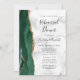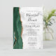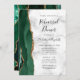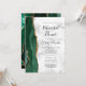 A borda esquerda deste elegante e moderno convite para o ensaio de casamento apresenta uma esmeralda verde aquarela agate borda com brilho dourado. O texto personalizável combina o script de escrita manual preto com fontes em itálico e em copperplate em uma cinza e fundo de mármore branco. O verso apresenta um design emerald verde e dourado.