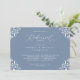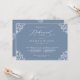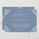 Estes elegantes convites de janto de ensaio de casamento azul são perfeitos para um tema de casamento clássico e sofisticado. O design apresenta um quadro de ornamentado vintage emparelhado com caligrafia elegante e texto clássico. O verso tem as iniciais do casal junto com um hospedado por linha para honrar os hosts do janto de ensaio (isso pode ser excluído se você não quiser).