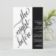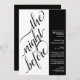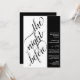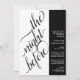 Este belo convite de janto de ensaio de casamento é moderno, simples e elegante. Ele apresenta um design preto e branco de dois painéis com caligrafia elegante na escrita à esquerda, lendo "a noite anterior" e todo o texto informativo para o ensaio de casamento e o janta à direita. O estilo minimalista limpo é ousado e artístico, mantendo ao mesmo tempo um sentimento subestimado.