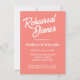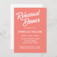 Simples estilo de janto de ensaio de casamento convites que apresentam letras brancas e estilizadas em um fundo de cor de coral. Edite seus convites substituindo nomes, data/hora, local e informações de contato por seus próprios nomes. Selecione o tamanho do convite e o estilo do papel.