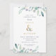 Barato personalizado estampado convites para janto de ensaio de casamento personalizados com seus detalhes de evento. Este elegante design apresenta uma folha de alumínio dourada falso com folhagem azul e verde delicada de cor d'água sobre fundo branco. Use as ferramentas de design para personalizar o texto, editar as fontes e as cores ou adicionar suas próprias fotos para criar um convite de festas minimalista moderno.
