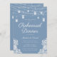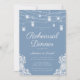 Este adorável convite azul empoeirado a um janto de ensaio com luzes de cordas e jarras de pedras no topo e belas bordas de rendas no fundo é leve, arejada e encantadora. As fontes são nítidas e modernas enquanto são clássicas e tradicionais. É perfeito para qualquer tema de casamento. Os convidados ficarão encantados em celebrá-lo como casal no seu janto de ensaio. É tão fácil fazer o seu. Basta selecionar Personalizar este modelo, digite suas informações e, em segundos, você poderá ver seus convites exclusivos e bonitos.
