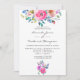 Rosas com temas e peões cor-de-rosa-quente sutil e convites para ensaios florais jantados com acentos de roxo, turquesa, azul e violeta.