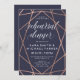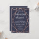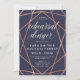 Esses convites para janto de ensaio elegantes e ultrna moda apresentam um design geométrico falsa rosa-ouro num fundo azul-meia-noite rico, e incluem caligrafia branca moderna.