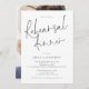 Janto de Ensaio de Casamento Moderno com Convite de Imagem. Disponível digitalmente e impresso. Este design moderno tem elegante roteiro informal para Janto de ensaio e o resto da tipografia que você pode personalizar facilmente. Você também pode alterar a cor do texto e do plano de fundo, se desejar, por meio da opção Personalizar Mais. Substitua a foto da amostra no verso por sua.