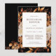 Convite para Janto de ensaio de casamento negro. Este elegante convite de janto de ensaio de casamento apresenta cor d'água queimada à mão, laranja queimada e folhas de terracota, creme e dahlias bege, e belos rosas de cor ferrugem num fundo preto. O verso inclui um buquê floral e foliar correspondente. Localize itens correspondentes na Coleção Romance de outono Preto.