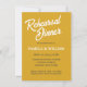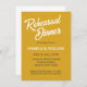 Simples estilo de janto de ensaio de casamento convites que apresentam letras brancas e pretas, estilizadas em um fundo de cor ouro amarelo em tendências. Edite seus convites substituindo nomes, data/hora, local e informações de contato por seus próprios nomes. Selecione o tamanho do convite e o estilo do papel.