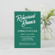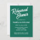 Simples estilo de janto de ensaio de casamento convites que apresentam letras brancas e estilizadas em um plano de fundo verde esmeralda. Edite seus convites substituindo nomes, data/hora, local e informações de contato por seus próprios nomes. Selecione o tamanho do convite e o estilo do papel.