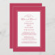 Trendy Magenta, convite para janto de ensaio de casamento vermelho, design apresenta uma bela borda chic em magenta que inclui uma elegante borda branca. A caligrafia e a escrita são vermelhos magenta num fundo branco. Um modelo moderno para data e ano complementa o design único de caligrafia. A parte traseira da placa tem uma cor sólida correspondente. Para obter melhores resultados, substitua os detalhes de modelo com os seus próprios detalhes, deixando espaço entre os parágrafos como no exemplo e use todas as letras maiúsculas quando especificado. Envie um email para invitationsuites@gmail.com com perguntas ou solicitações de cores personalizadas.