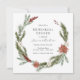 O convite do janto de ensaio de casamentos com tema de inverno apresenta um quadro de cor d'água por fundo de verde-d'água, poinsettias e pinecones. Personalize com suas informações ou clique em "Clique para personalizar mais" para editar estilos de fonte, tamanho e cores.