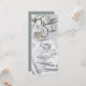 Os convites de janto de ensaio apresentam os seus detalhes sobre um fundo de definição de eucalipto e de mesa de flores brancas.