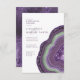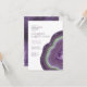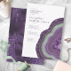 Nem todos os designs de casamento são criados iguais. Os layouts assimétricos para as peças neste impressionante conjunto de casamento provam que isso não é ruim! Bandas de cor onduladas em tons contrastantes de roxo violeta e verde com um centro de cristal brilhando formam um sotaque geode/agate na maioria das peças do conjunto. O convite 'Janto de ensaio' do casamento mostrado aqui apresenta o acima mais uma modelo para adicionar os detalhes do evento e as informações de RSVP para os seus convidados. O reverso tem um fundo de abstrato de coordenação que lembra a pedra veiculada com brilho. Procure ID647 para ver todas as peças de coordenação neste conjunto.