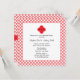 Monogramas de padrão de quatrefoil vermelho nos convites para janto de ensaio. Um padrão simples e elegante. O fundo é branco.