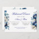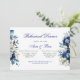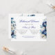 Um belamente ilustrado buquê de flores. As flores estão predominantemente em tons de azul real, branco e bege, com detalhes intrincados destacando suas pétalas, estames e folhas. O buquê é posicionado centralmente e as flores parecem ser dispostas em cascata, com algumas folhas e flores menores espiando-se pelas laterais. A paleta de cores é macia e calmante, com fundo branco que contrasta fortemente com as flores vibrantes.