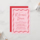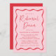 Convide convidados para o seu janto de ensaio em estilo com os nossos convites para janto de ensaio de casamento do Modern Pink e do Red Wavy Frame. O design apresenta as palavras "Janto de ensaio" apresentadas num script vermelho manuscrito que contrasta um fundo rosa. Os detalhes do seu janto de ensaio estão cercados por uma borda ondulada vermelha. Este convite à janta de ensaios retrorreflectores é perfeito para usar em jantadas de ensaio casuais e modernas.