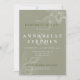 Um convite de janto de cor oliva com sotaques de galho exude um charme natural, rústico, mas sofisticado — perfeito para uma relaxada, mas elegante reunião pré-casamento. O fundo é um sábio macio, verde-oliva-suja, ou lavagem a aquarela texturizada, dando-lhe uma sensação quente e orgânica. Os ramos de oliveira, pintados à mão, com folhas verdes acastanhadas e minúsculas azeitonas, apresentam graciosamente os bordos ou cantos do design, evocando uma estética toscana ou mediterrânica.