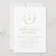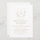 Dourado e branco, convite para jantar ensaios minimalistas, com as suas iniciais monogramadas enquadradas por uma crista elegante e folhas botânicas ilustradas à mão no topo. Os detalhes do evento são mostrados abaixo no script moderno e na fonte clássica. Simples e luxo. Ver todas as peças correspondentes na coleção