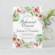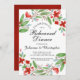 Este belo convite de janto de ensaio de casamento apresenta um elegante design bóho com prigos de flores de aquarela vermelha e verde em fundo branco.