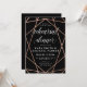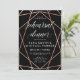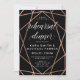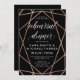 Estes convites para janto de ensaio elegantes e ultrna moda apresentam um design geométrico falsa rosa-ouro num fundo preto dramático, e incluem a tipografia caligráfica branca moderna.