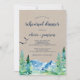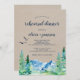 Este convite de janto de ensaio de Rocky Mountain é perfeito para um ensaio de casamento ao ar livre. O design apresenta uma paisagem de natureza selvagem pintada, azul e verde, com pinheiros de aquarela, pássaros e montanhas em um fundo falso de papel kraft claro. Por favor, observe que isto não está impresso em papel kraft real. É um gráfico de alta qualidade feito para parecer papel kraft.