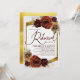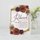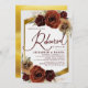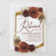 O convite de janto de ensaio de casamento apresenta óleo rústico pintado com lenha de urna ardósia em tona outono, flores em verde e grama de pampas com uma elegante fuselagem de ouro e fundo.