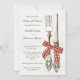 Convide seus convidados para um janto de ensaio confortável e casual com este convite de janto de ensaio que inclui pratos de prata e um pano de fundo vermelho de mesa.