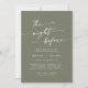 Este convite de janto de ensaio de verde-oliva boho é perfeito para uma noite minimalista antes do ensaio de casamento. A design boêmica moderna de tom verde-escuro de madeira apresenta caligrafia rustica simples com um estilo único, mas clássico.