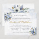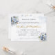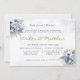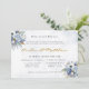 Design apresenta um elemento floral impresso em tons de azul empoeirado e ouro sobre folhas verdes e floradas de pedras e rosa. Excelente para as comemorações do casamento!