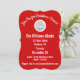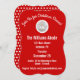 Convite elegante de Natal com fundo vermelho, uma bela ilustração de um ornamento prateado realçado em um círculo branco. Fonte branca clássica com informações completas, que pode ser alterada nas áreas editáveis. A parte traseira tem bolinhas brancas sobre fundo vermelho contrastante para corresponder à cor frontal.