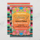 Coloridos convites para Janto de ensaio do Partido Fiesta Mexicano. Apresenta papel picado brilhante inspira flores, sotaques dourados, maracas e um fundo mexicano asteca.