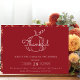 Celebrar Ação de Graças com seus entes queridos com este convite moderno e elegante. O convite inclui uma abóbora com a palavra "agradecido", colocada sobre um fundo vermelho de folha de outono. A maneira perfeita de convidar seus convidados para uma noite memorável de comida, diversão e palhaçada.