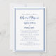 Simples e clássico, azul e branco, o convite para janto de ensaio de casamento apresenta um simples design minimalista contemporâneo com uma dupla borda em azul num fundo branco nítido. Personalize a design de casamento com seus detalhes em letras de tendências e roteiro em azul. As costas combinam em azul sólido. Para obter melhores resultados, substitua os detalhes do modelo com seus próprios detalhes, deixando espaço entre os parágrafos como no exemplo e use todas as letras minúsculas quando especificado. Envie um email para invitationsuites@gmail.com com perguntas ou solicitações personalizadas.